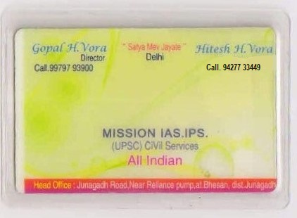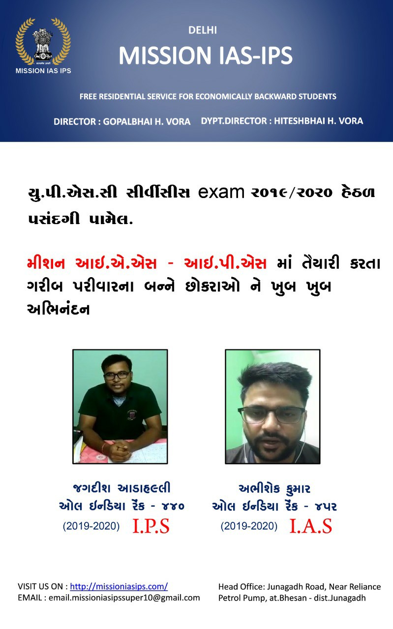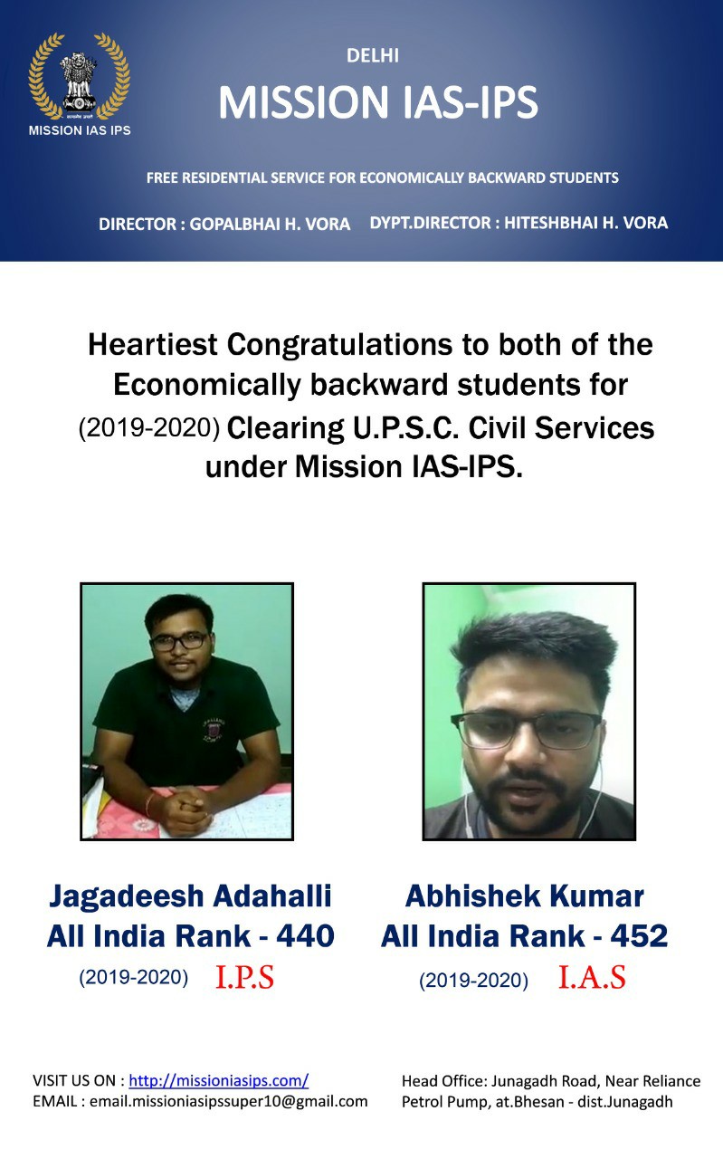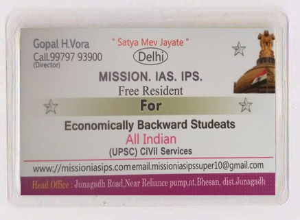 MISSION IAS IPS is a free residential programme for civil service aspirants whose family are economically backward. Established in 2016 under the banner of two brothers Gopal Bhai H. Vora and Hitesh Bhai H. Vora , the MISSION IAS IPS is totally a self financed body.